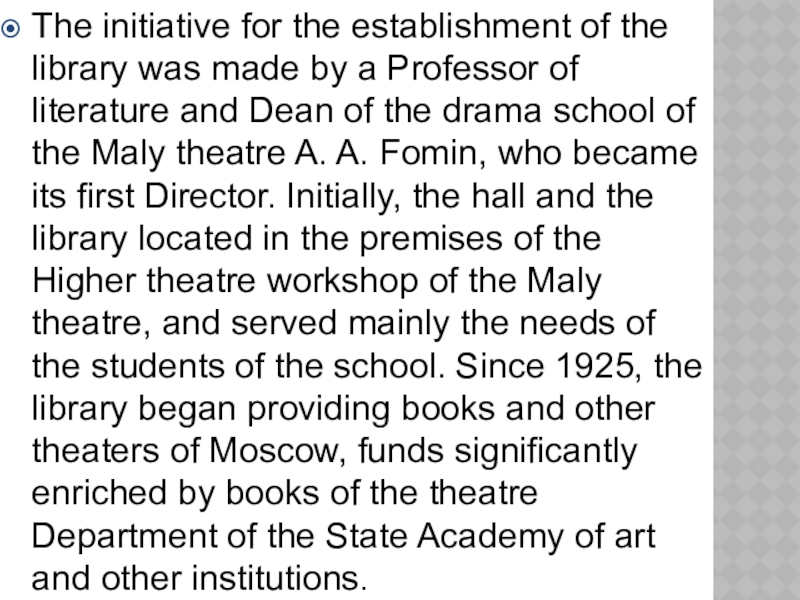 a Professor of literature and Dean of the drama school of the Maly theatre A. A. Fomin, who became its first Director. Initially, the hall and the library located in the premises of the Higher theatre workshop of the Maly theatre, and served mainly the needs of the students of the school. Since 1925, the library began providing books and other theaters of Moscow, funds significantly enriched by books of the theatre Department of the State Academy of art and other institutions.