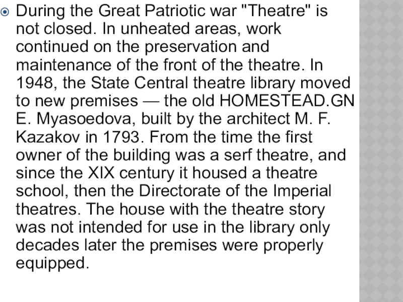 areas, work continued on the preservation and maintenance of the front of the theatre. In 1948, the State Central theatre library moved to new premises — the old HOMESTEAD.GN E. Myasoedova, built by the architect M. F. Kazakov in 1793. From the time the first owner of the building was a serf theatre, and since the XIX century it housed a theatre school, then the Directorate of the Imperial theatres. The house with the theatre story was not intended for use in the library only decades later the premises were properly equipped.