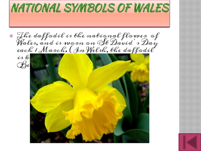 on St David’s Day each 1 March. (In Welsh, the daffodil is known as "Peter's Leek", cenhinen Bedr/Cenin pedr.)