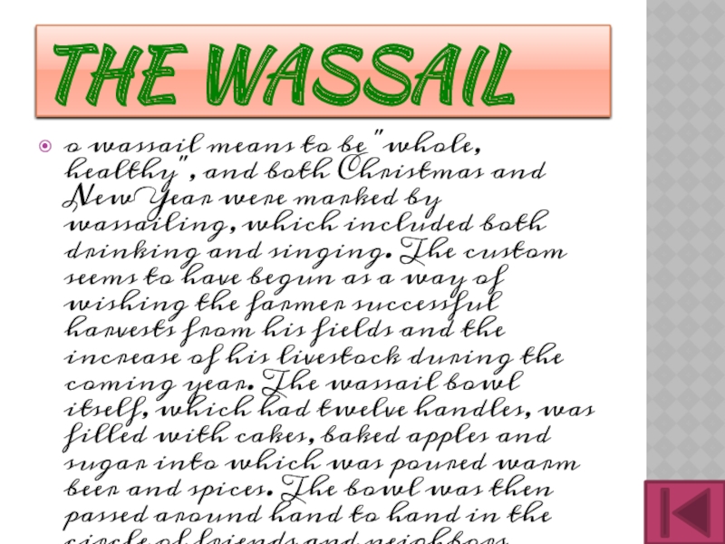 and New Year were marked by wassailing, which included both drinking and singing. The custom seems to have begun as a way of wishing the farmer successful harvests from his fields and the increase of his livestock during the coming year. The wassail bowl itself, which had twelve handles, was filled with cakes, baked apples and sugar into which was poured warm beer and spices. The bowl was then passed around hand to hand in the circle of friends and neighbors gathered round the blazing fire until the beer was consumed. The remaining food was then shared out and eaten. On Twelfth Night, the wassail bowl was taken to the house of newlyweds or to a family which had recently come to live in the district, songs were sung outside the house door. Those inside the house would recited or sing special verses, to be answered by the revelers outside.