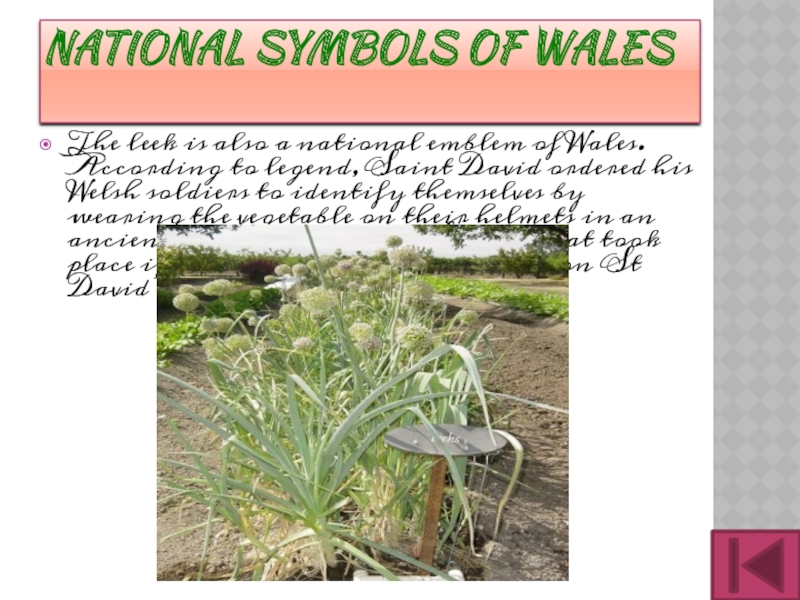 legend, Saint David ordered his Welsh soldiers to identify themselves by wearing the vegetable on their helmets in an ancient battle against the Saxons that took place in a leek field. It is still worn on St David’s Day each 1 March