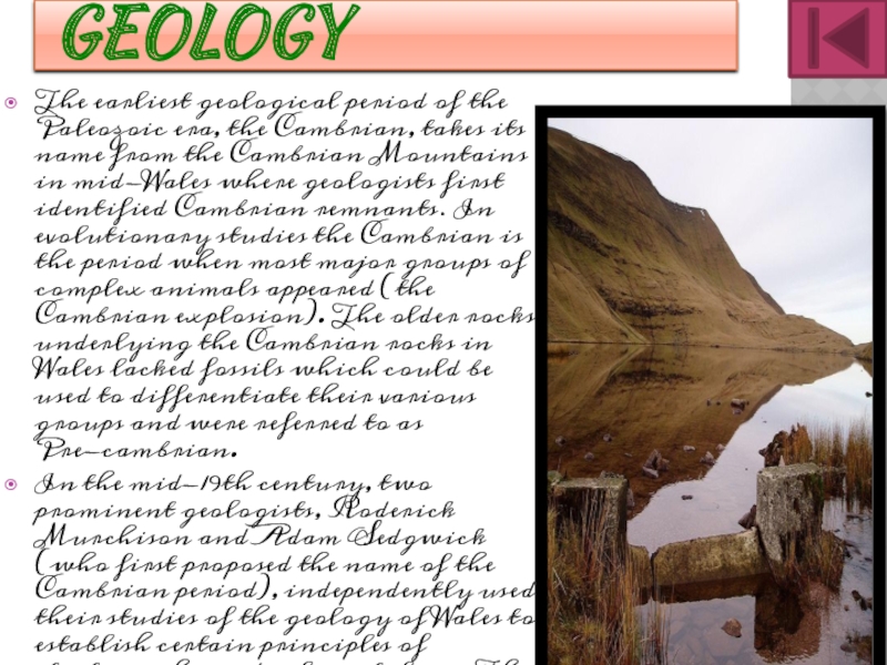 takes its name from the Cambrian Mountains in mid-Wales where geologists first identified Cambrian remnants. In evolutionary studies the Cambrian is the period when most major groups of complex animals appeared (the Cambrian explosion). The older rocks underlying the Cambrian rocks in Wales lacked fossils which could be used to differentiate their various groups and were referred to as Pre-cambrian.
