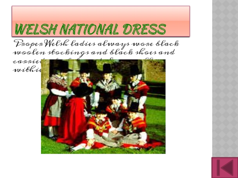 Слайд 19Proper Welsh ladies always wore black woolen stockings and black shoes