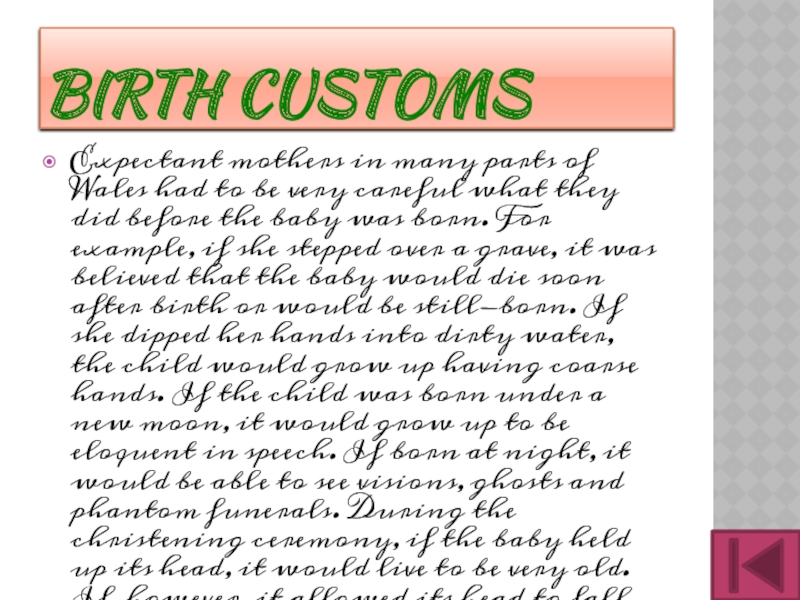 very careful what they did before the baby was born. For example, if she stepped over a grave, it was believed that the baby would die soon after birth or would be still-born. If she dipped her hands into dirty water, the child would grow up having coarse hands. If the child was born under a new moon, it would grow up to be eloquent in speech. If born at night, it would be able to see visions, ghosts and phantom funerals. During the christening ceremony, if the baby held up its head, it would live to be very old. If, however, it allowed its head to fall back or to rest on the arm of the person holding it, the child would die an early death. At some christening ceremonies, specially designed drinking glasses were used to consume prodigious amounts of liquor in toasts to the newly baptized infant. (to be fair, it has to be remembered that it is only in this century that most of the water supplies in Wales have become fit to drink, and beer was always not only considered a safe drink, but was also thought to confer strength).