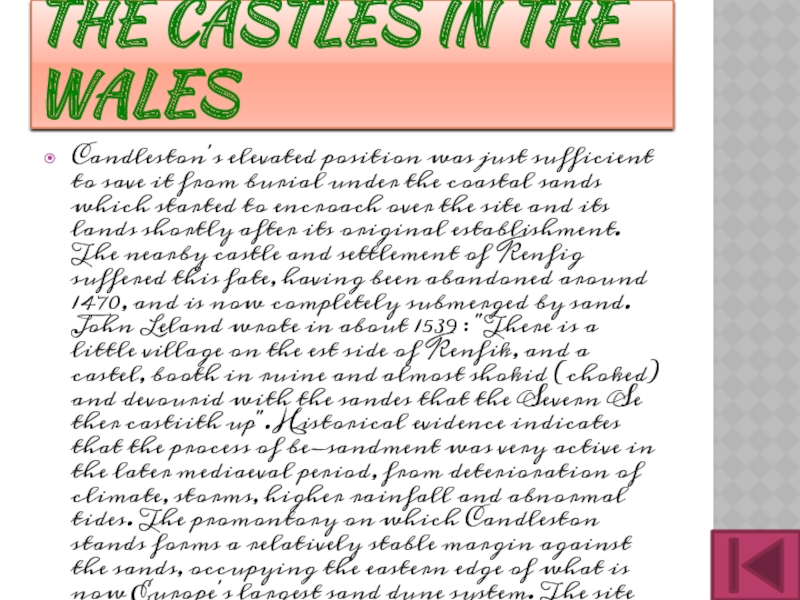 save it from burial under the coastal sands which started to encroach over the site and its lands shortly after its original establishment. The nearby castle and settlement of Kenfig suffered this fate, having been abandoned around 1470, and is now completely submerged by sand. John Leland wrote in about 1539 : "There is a little village on the est side of Kenfik, and a castel, booth in ruine and almost shokid (choked) and devourid with the sandes that the Severn Se ther castiith up". Historical evidence indicates that the process of be-sandment was very active in the later mediaeval period, from deterioration of climate, storms, higher rainfall and abnormal tides. The promontory on which Candleston stands forms a relatively stable margin against the sands, occupying the eastern edge of what is now Europe's largest sand dune system. The site thus commands spectacular vistas over an extensive tract of lofty dunes, some up to 200 ft (61 m). high, to the N.S.& W. To the S. the sands cover the eroded former wooded manorial terrain of Merthyr Mawr Warren,covering some 900 acres (3.6 km2), and to the W. cover what is believed to be a former related ancient settlement, known in Welsh as Tregantlow. In 1823 the shifting sands exposed 300 yards to the W. substantial remains of the manorial windmill, the foundations of further buildings reportedly having been seen nearby. Clearly, the chronically encroaching sands caused the decline of the manor and ultimate abandonment of the Castle.
