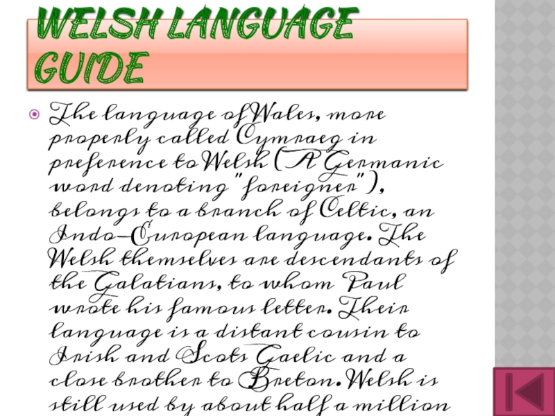 preference to Welsh (A Germanic word denoting "foreigner"), belongs to a branch of Celtic, an Indo-European language. The Welsh themselves are descendants of the Galatians, to whom Paul wrote his famous letter. Their language is a distant cousin to Irish and Scots Gaelic and a close brother to Breton. Welsh is still used by about half a million people within Wales and possibly another few hundred thousand in England and other areas overseas.