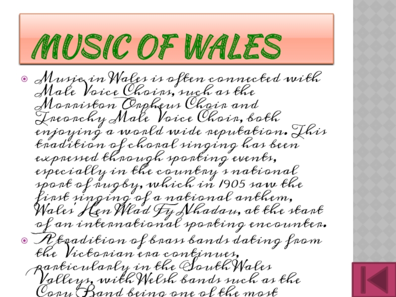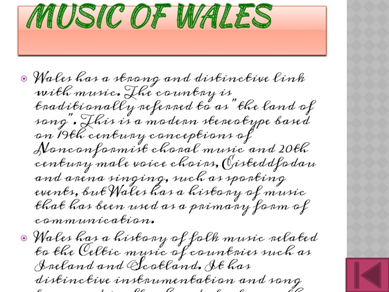 music. The country is traditionally referred to as "the land of song". This is a modern stereotype based on 19th century conceptions of Nonconformist choral music and 20th century male voice choirs, Eisteddfodau and arena singing, such as sporting events, but Wales has a history of music that has been used as a primary form of communication.