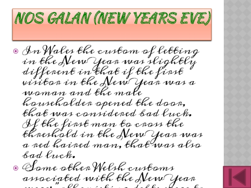 Some other Welsh customs associated with the New Year were: "all existing debts were to be paid"; never lend anything to anyone on New Years Day else you would have bad luck; and the behaviour of an individual on this day was an indication of how they would behave all year!