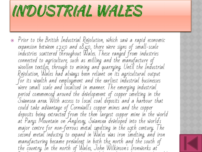 economic expansion between 1750 and 1850, there were signs of small-scale industries scattered throughout Wales. These ranged from industries connected to agriculture, such as milling and the manufacture of woollen textiles, through to mining and quarrying. Until the Industrial Revolution, Wales had always been reliant on its agricultural output for its wealth and employment and the earliest industrial businesses were small scale and localised in manner. The emerging industrial period commenced around the development of copper smelting in the Swansea area. With access to local coal deposits and a harbour that could take advantage of Cornwall's copper mines and the copper deposits being extracted from the then largest copper mine in the world at Parys Mountain on Anglesey, Swansea developed into the world's major centre for non-ferrous metal smelting in the 19th century. The second metal industry to expand in Wales was iron smelting, and iron manufacturing became prevalent in both the north and the south of the country. In the north of Wales, John Wilkinson's Ironworks at Bersham was a significant industry, while in the south, a second world centre of metallurgy was founded in Merthyr Tydfil, where the four ironworks of Dowlais, Cyfarthfa, Plymouth and Penydarren became the most significant hub of iron manufacture in Wales. In the 1820s, south Wales alone accounted for 40% of all pig iron manufactured in Britain.