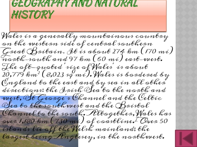 western side of central southern Great Britain. It is about 274 km (170 mi) north–south and 97 km (60 mi) east–west. The oft-quoted 'size of Wales' is about 20,779 km2 (8,023 sq mi). Wales is bordered by England to the east and by sea in all other directions: the Irish Sea to the north and west, St George's Channel and the Celtic Sea to the southwest and the Bristol Channel to the south. Altogether, Wales has over 1,180 km (730 mi) of coastline.[Over 50 islands lie off the Welsh mainland; the largest being Anglesey, in the northwest.