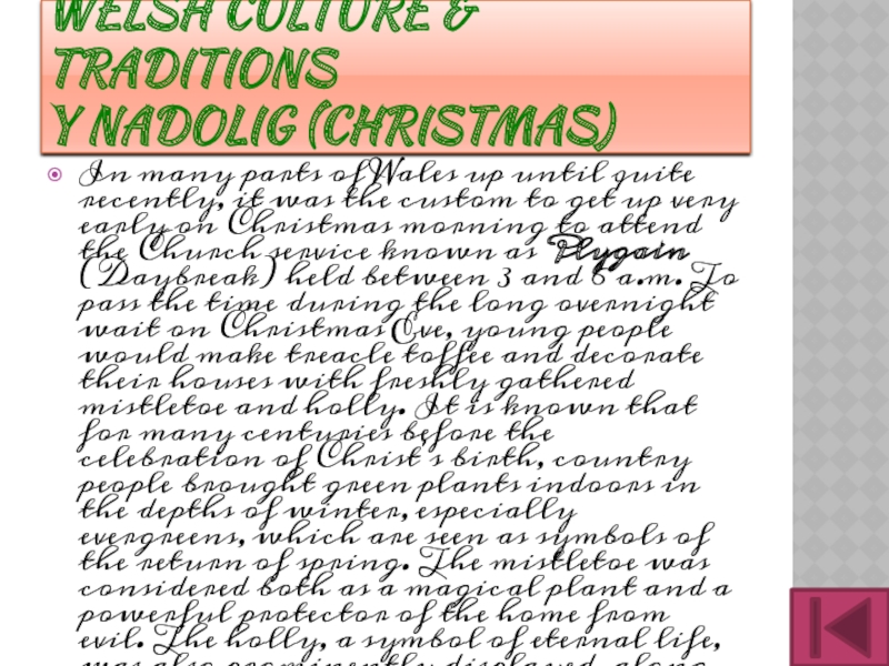 up until quite recently, it was the custom to get up very early on Christmas morning to attend the Church service known as Plygain (Daybreak) held between 3 and 6 a.m. To pass the time during the long overnight wait on Christmas Eve, young people would make treacle toffee and decorate their houses with freshly gathered mistletoe and holly. It is known that for many centuries before the celebration of Christ's birth, country people brought green plants indoors in the depths of winter, especially evergreens, which are seen as symbols of the return of spring. The mistletoe was considered both as a magical plant and a powerful protector of the home from evil. The holly, a symbol of eternal life, was also prominently displayed, along with the ivy, rosemary and bay leaves. All too, had pleasant scents to disguise the many foul odors that had built up during the long months when doors and windows were shut tight against the winter cold. Dancing and singing to the harp under their festoons of greenery, many people spent an enjoyable Christmas Eve with their neighbors until the more serious time arrived to go to church.