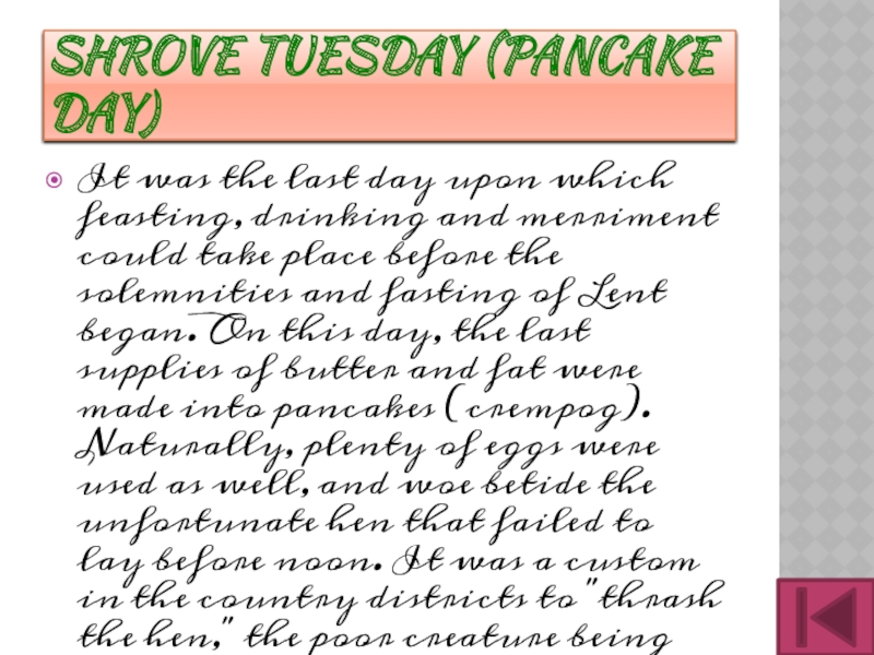 drinking and merriment could take place before the solemnities and fasting of Lent began. On this day, the last supplies of butter and fat were made into pancakes (crempog). Naturally, plenty of eggs were used as well, and woe betide the unfortunate hen that failed to lay before noon. It was a custom in the country districts to "thrash the hen," the poor creature being taken out to the village green or large pasture and buried in a hole in the ground with only her head sticking out. Blindfolded youths would then try to hit the hen with a stick. If anyone succeeded, the hen would become his property, to be killed on the following day and cooked and eaten with the proper ceremony.