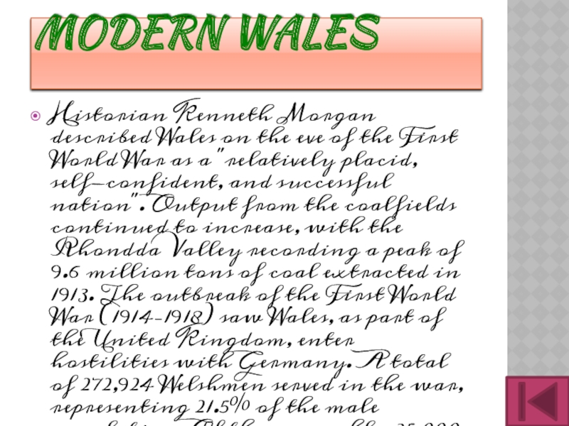 First World War as a "relatively placid, self-confident, and successful nation". Output from the coalfields continued to increase, with the Rhondda Valley recording a peak of 9.6 million tons of coal extracted in 1913. The outbreak of the First World War (1914–1918) saw Wales, as part of the United Kingdom, enter hostilities with Germany. A total of 272,924 Welshmen served in the war, representing 21.5% of the male population. Of these, roughly 35,000 were killed. The two most notable battles of the War to include Welsh forces were those at Mametz Wood on the Somme and Third Ypres.