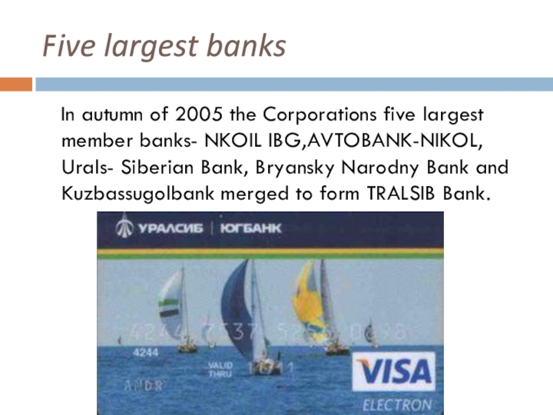 Five largest banks  In autumn of 2005 the Corporations five largest member banks- NKOIL IBG,AVTOBANK-NIKOL, Urals-