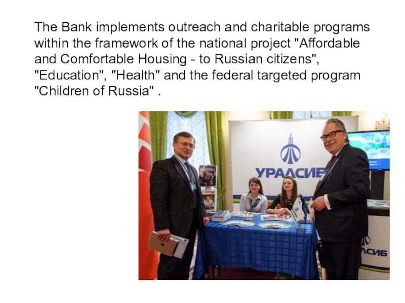 Слайд 6The Bank implements outreach and charitable programs within the framework of