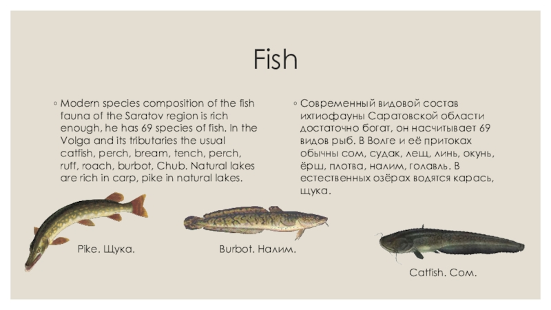 Современный видовой состав ихтиофауны Саратовской области достаточно богат, он насчитывает 69 видов рыб. В Волге и её притоках обычны сом, судак, лещ, линь, окунь, ёрш, плотва, налим, голавль. В естественных озёрах водятся карась, щука.