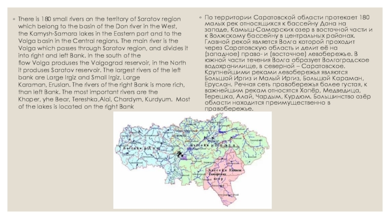 По территории Саратовской области протекает 180 малых рек относящихся к бассейну Дона на западе, Камыш-Самарских озер в восточной части и к Волжскому бассейну в центральных районах. Главной рекой является Волга которой проходит через Саратовскую область и делит её на (западное) право- и (восточное) левобережье. В южной части течения Волга образует Волгоградское водохранилище, в северной – Саратовское. Крупнейшими реками левобережья являются Большой Иргиз и Малый Иргиз, Большой Караман, Еруслан. Речная сеть правобережья более густая, к важнейшим рекам относятся Хопёр, Медведица, Терешка, Алай, Чардым, Курдюм. Большинство озёр области находится преимущественно в правобережье.