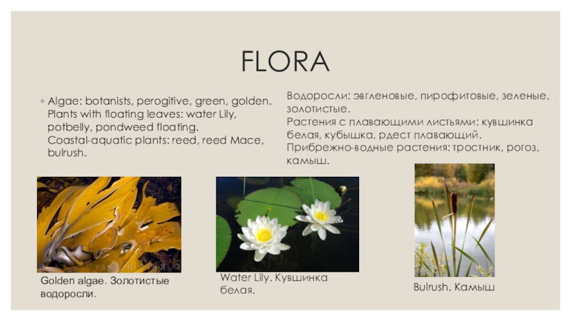 Водоросли: эвгленовые, пирофитовые, зеленые, золотистые.