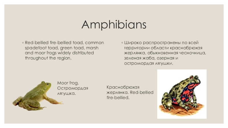 Широко распространены по всей территории области краснобрюхая жерлянка, обыкновенная чесночница, зеленая жаба, озерная и остромордая лягушки.
