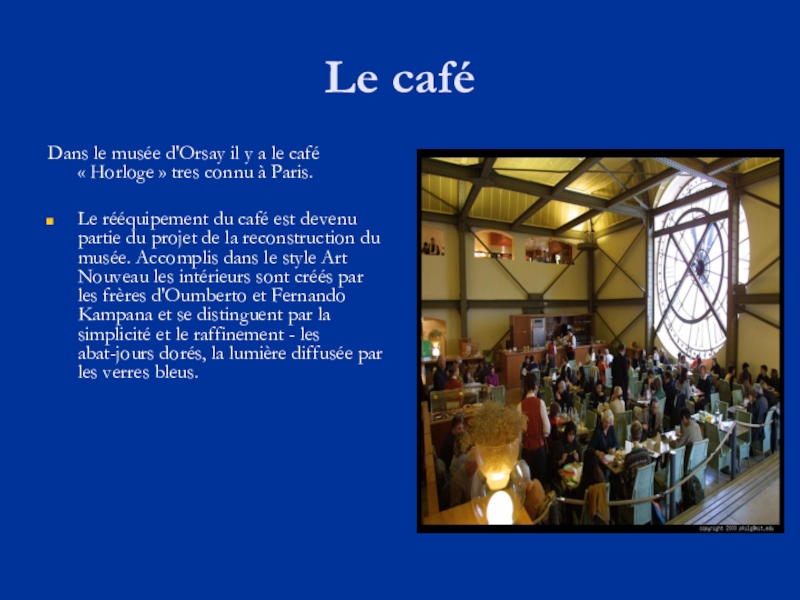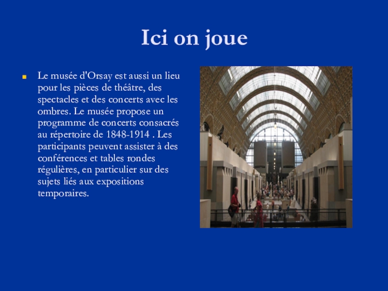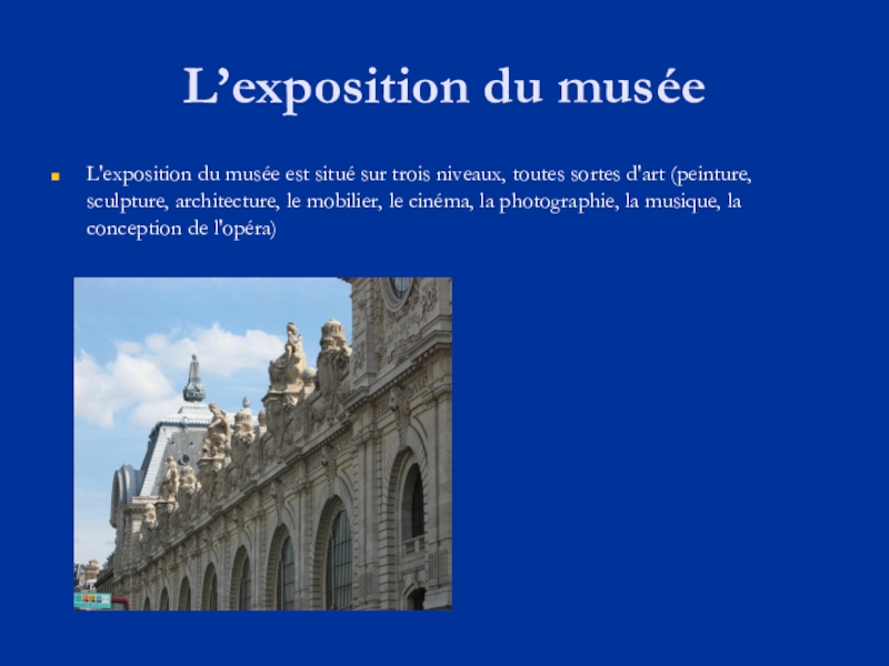 gauche, abrite une des plus grandes collections de peintures françaises et des sculptures de la période 1848-1914. La collection se compose d‘œuvres d'impressionnistes et de poste-impressionnistes. La collection est également riche en œuvres d'art décoratif dans le style Art Nouveau, des photos et des architectures d'objets.