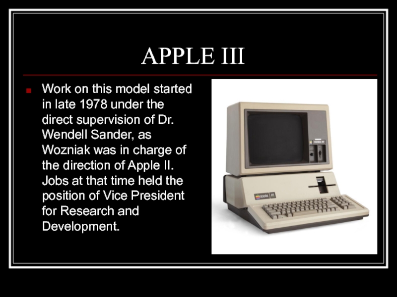 Work on this model started in late 1978 under the direct supervision of Dr. Wendell Sander, as Wozniak was in charge of the direction of Apple II. Jobs at that time held the position of Vice President for Research and Development.