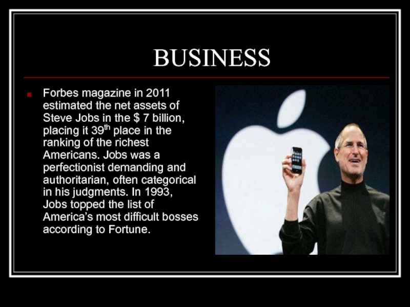 in the $ 7 billion, placing it 39th place in the ranking of the richest Americans. Jobs was a perfectionist demanding and authoritarian, often categorical in his judgments. In 1993, Jobs topped the list of America’s most difficult bosses according to Fortune.