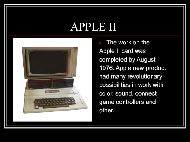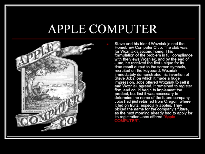 Wozniak joined the Homebrew Computer Club. The club was for Wozniak’s second home. This formulation of the problem in full compliance with the views Wozniak, and by the end of June, he received the first unique for its time result output to the screen symbols, recruited on the keyboard. Wozniak immediately demonstrated his invention of Steve Jobs, on which it made a huge impression. Jobs offered Wozniak to sell it and Wozniak agreed. It remained to register firm, and could begin to implement the product, but first it was necessary to determine the name of the future company. Jobs had just returned from Oregon, where it fed on fruits, especially apples. They picked the name for the company’s future, as the next morning already had to apply for its registration Jobs offered “Apple COMPUTER”.