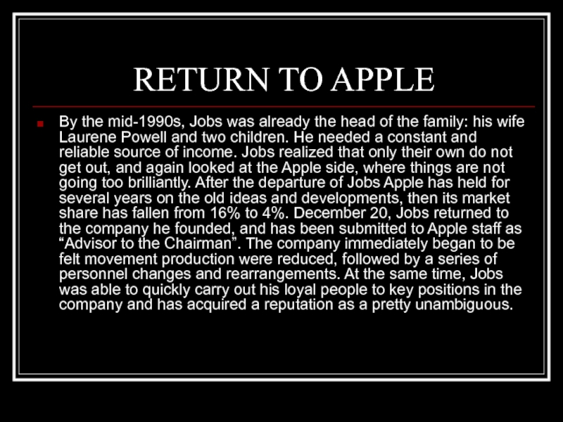 Jobs was already the head of the family: his wife Laurene Powell and two children. He needed a constant and reliable source of income. Jobs realized that only their own do not get out, and again looked at the Apple side, where things are not going too brilliantly. After the departure of Jobs Apple has held for several years on the old ideas and developments, then its market share has fallen from 16% to 4%. December 20, Jobs returned to the company he founded, and has been submitted to Apple staff as “Advisor to the Chairman”. The company immediately began to be felt movement production were reduced, followed by a series of personnel changes and rearrangements. At the same time, Jobs was able to quickly carry out his loyal people to key positions in the company and has acquired a reputation as a pretty unambiguous.