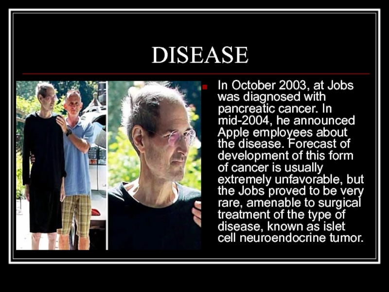 In October 2003, at Jobs was diagnosed with pancreatic cancer. In mid-2004, he announced Apple employees about the disease. Forecast of development of this form of cancer is usually extremely unfavorable, but the Jobs proved to be very rare, amenable to surgical treatment of the type of disease, known as islet cell neuroendocrine tumor.