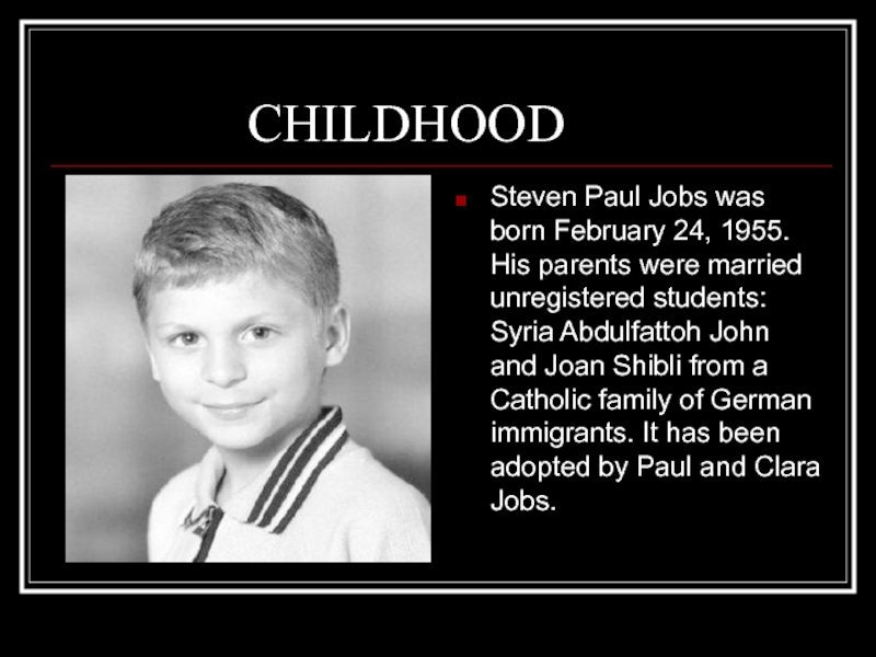 born February 24, 1955. His parents were married unregistered students: Syria Abdulfattoh John and Joan Shibli from a Catholic family of German immigrants. It has been adopted by Paul and Clara Jobs.