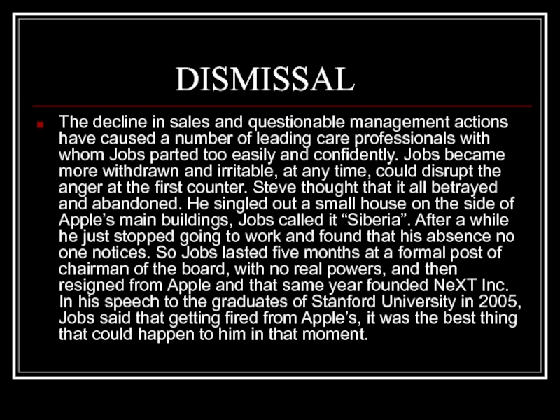 sales and questionable management actions have caused a number of leading care professionals with whom Jobs parted too easily and confidently. Jobs became more withdrawn and irritable, at any time, could disrupt the anger at the first counter. Steve thought that it all betrayed and abandoned. He singled out a small house on the side of Apple’s main buildings, Jobs called it “Siberia”. After a while he just stopped going to work and found that his absence no one notices. So Jobs lasted five months at a formal post of chairman of the board, with no real powers, and then resigned from Apple and that same year founded NeXT Inc. In his speech to the graduates of Stanford University in 2005, Jobs said that getting fired from Apple’s, it was the best thing that could happen to him in that moment.