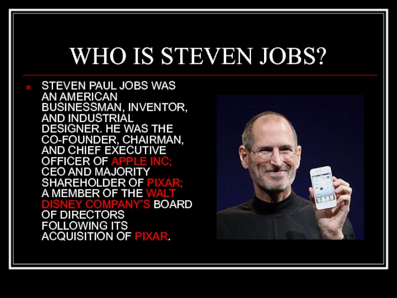AN AMERICAN BUSINESSMAN, INVENTOR, AND INDUSTRIAL DESIGNER. HE WAS THE CO-FOUNDER, CHAIRMAN, AND CHIEF EXECUTIVE OFFICER OF APPLE INC; CEO AND MAJORITY SHAREHOLDER OF PIXAR; A MEMBER OF THE WALT DISNEY COMPANY’S BOARD OF DIRECTORS FOLLOWING ITS ACQUISITION OF PIXAR.