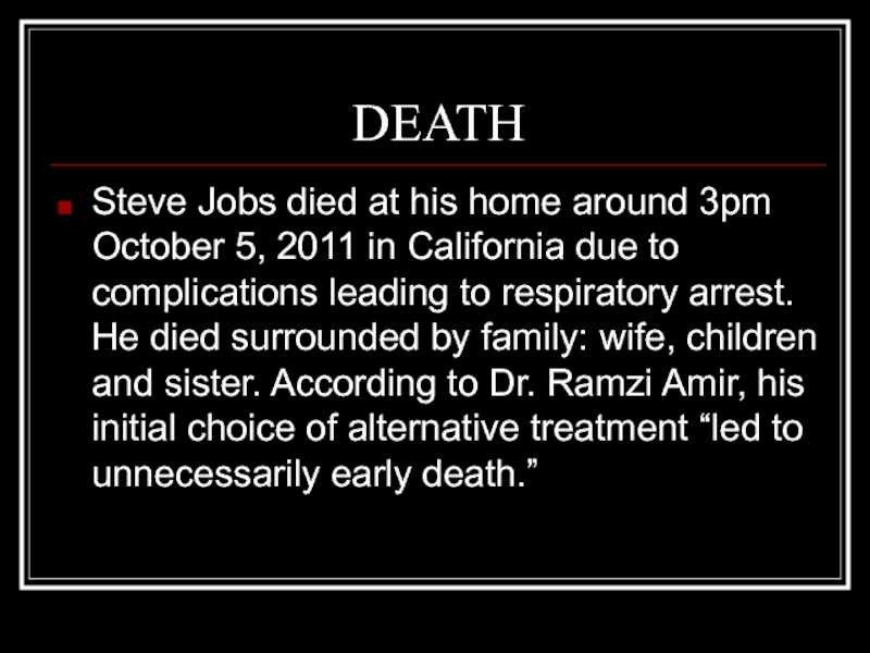 Steve Jobs died at his home around 3pm October 5, 2011 in California due to complications leading to respiratory arrest. He died surrounded by family: wife, children and sister. According to Dr. Ramzi Amir, his initial choice of alternative treatment “led to unnecessarily early death.”