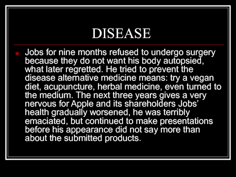 Jobs for nine months refused to undergo surgery because they do not want his body autopsied, what later regretted. He tried to prevent the disease alternative medicine means: try a vegan diet, acupuncture, herbal medicine, even turned to the medium. The next three years gives a very nervous for Apple and its shareholders Jobs’ health gradually worsened, he was terribly emaciated, but continued to make presentations before his appearance did not say more than about the submitted products.