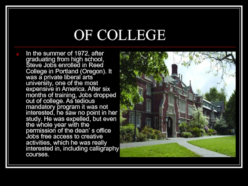 summer of 1972, after graduating from high school, Steve Jobs enrolled in Reed College in Portland (Oregon). It was a private liberal arts university, one of the most expensive in America. After six months of training, Jobs dropped out of college. As tedious mandatory program it was not interested, he saw no point in her study. He was expelled, but even the whole year with the permission of the dean’ s office Jobs free access to creative activities, which he was really interested in, including calligraphy courses.