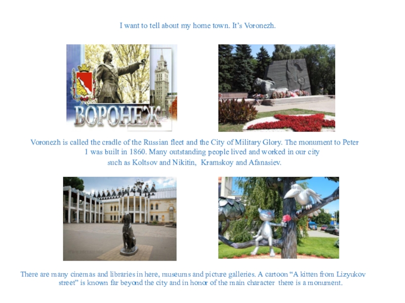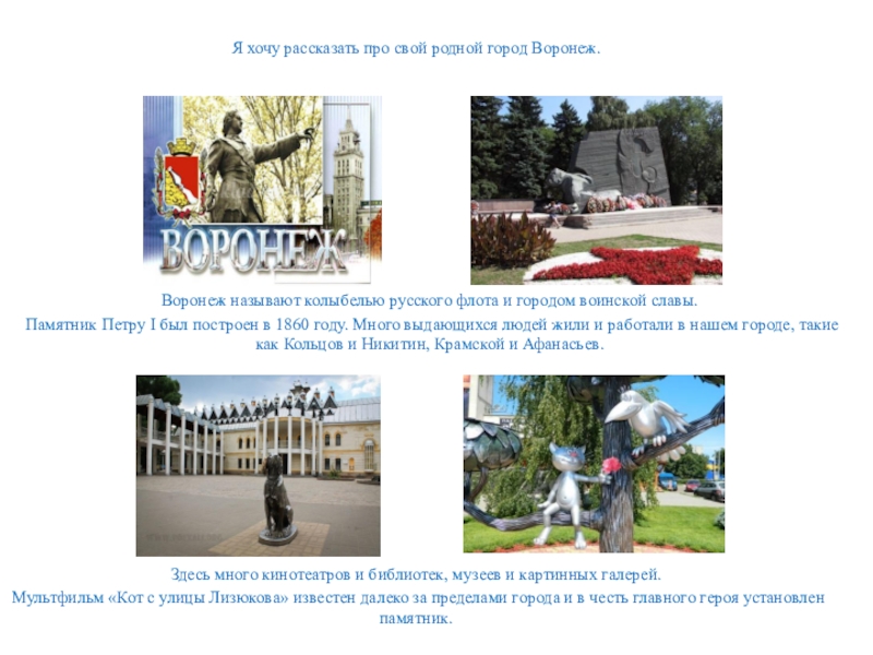 Voronezh is called the cradle of the Russian fleet and the City of Military Glory. The monument to Peter 1 was built in 1860. Many outstanding people lived and worked in our city