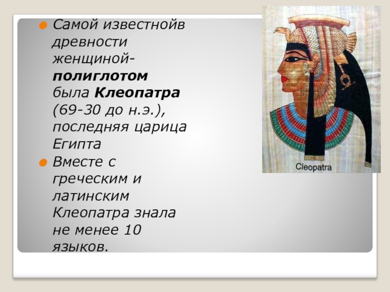Самой известнойв древности женщиной-полиглотом была Клеопатра (69-30 до н.э.), последняя царица ЕгиптаВместе с греческим и латинским Клеопатра
