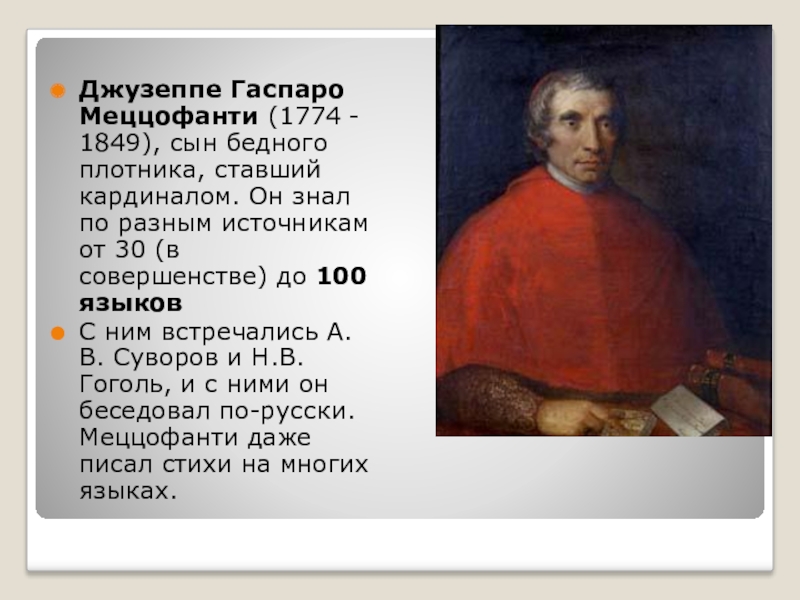 Джузеппе Гаспаро Меццофанти (1774 - 1849), сын бедного плотника, ставший кардиналом. Он знал по разным источникам от