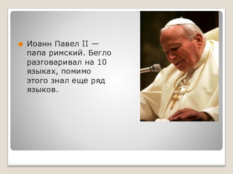 Иоанн Павел II — папа римский. Бегло разговаривал на 10 языках, помимо этого знал еще ряд языков.