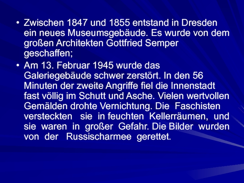 Слайд 5Zwischen 1847 und 1855 entstand in Dresden ein neues Museumsgebäude. Es