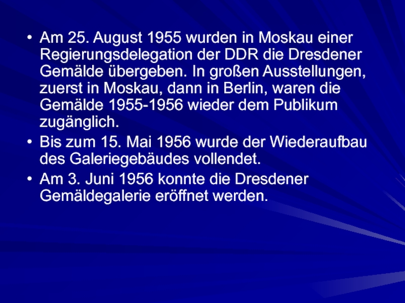 die Dresdener Gemälde übergeben. In großen Ausstellungen, zuerst in Moskau, dann in Berlin, waren die Gemälde 1955-1956 wieder dem Publikum zugänglich.