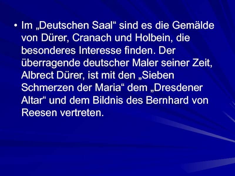 Слайд 9Im „Deutschen Saal“ sind es die Gemälde von Dürer, Cranach und