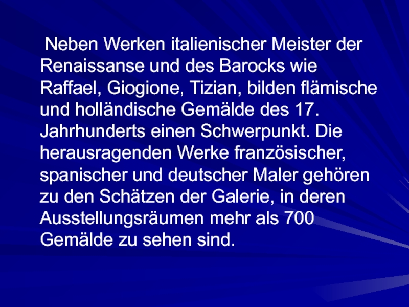 Слайд 3 Hier befindet sich die weltberühmte Dresdener Gemäldegalerie. Sie enthält reiche Bestände