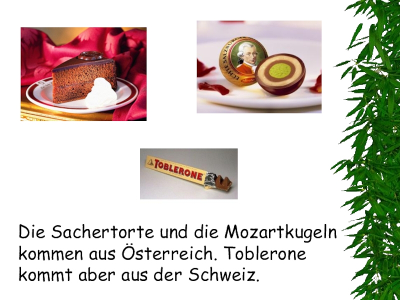 Слайд 3Die Sachertorte und die Mozartkugeln kommen aus Österreich. Toblerone kommt aber