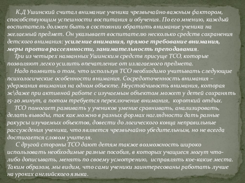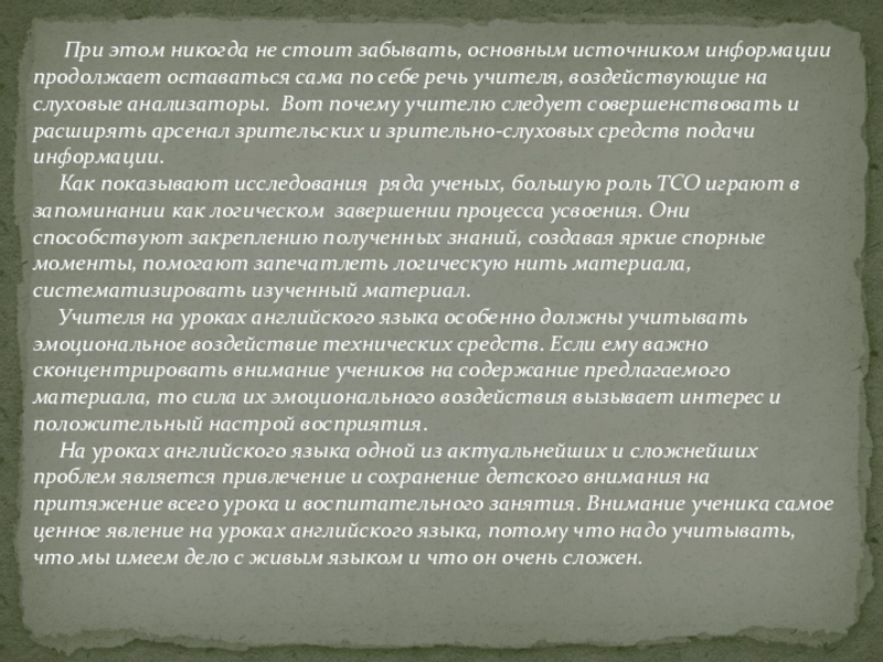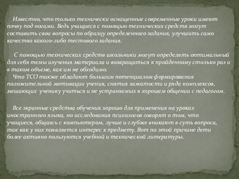 Все экранные средства обучения хорошо для применения на уроках иностранного языка, но исследования психологов говорят о том, что учащиеся, общаясь с компьютером, лучше и глубже вникают в суть вопроса, так как у них появляется интерес к предмету. Вот по этой причине дети более активно пользуются учебной и технической литературы.