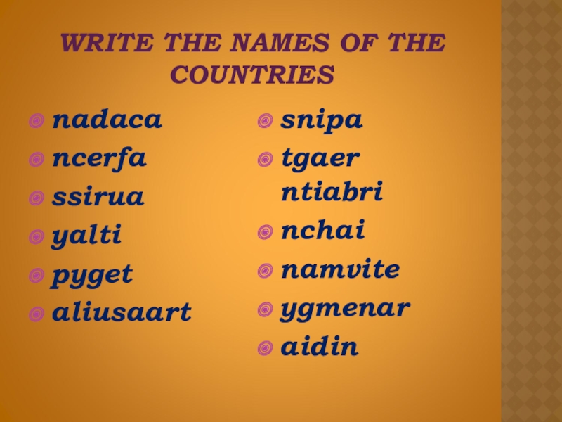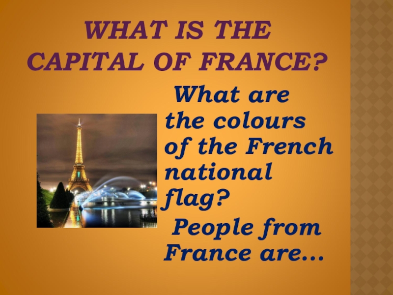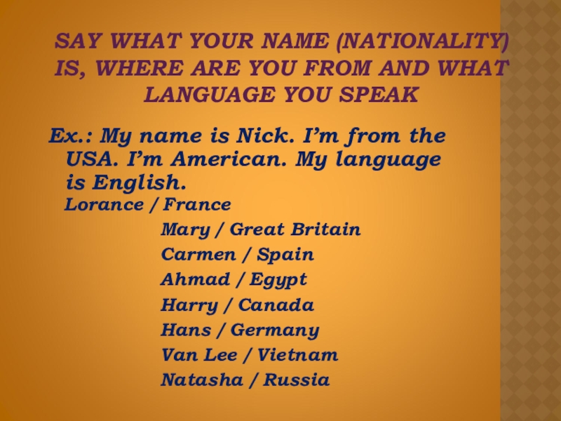 Ex.: My name is Nick. I’m from the USA. I’m American. My language is English. Lorance / France