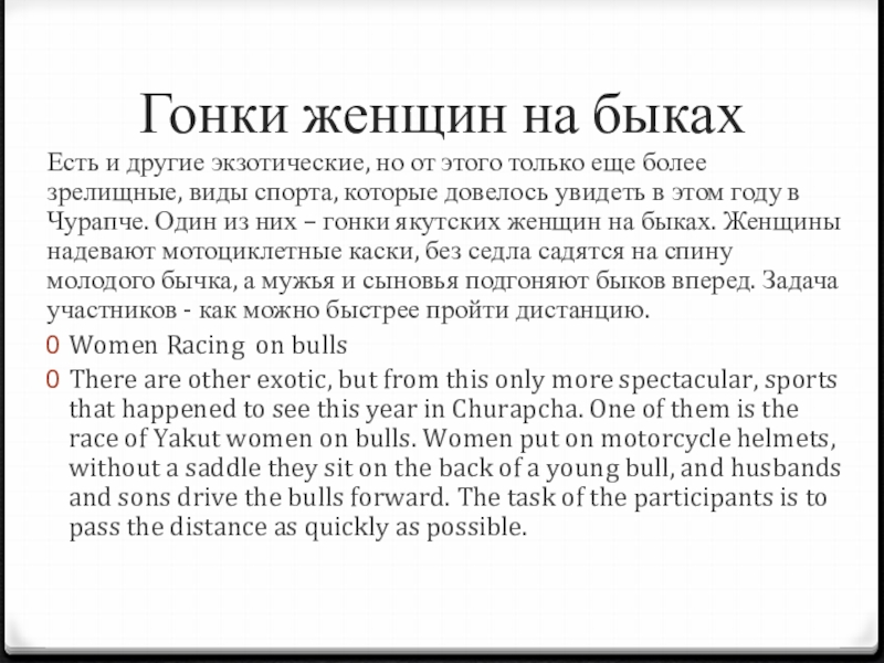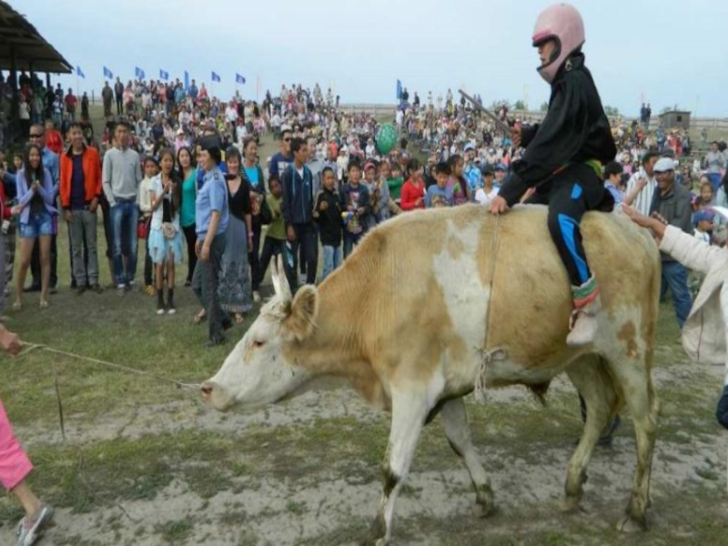 еще более зрелищные, виды спорта, которые довелось увидеть в этом году в Чурапче. Один из них – гонки якутских женщин на быках. Женщины надевают мотоциклетные каски, без седла садятся на спину молодого бычка, а мужья и сыновья подгоняют быков вперед. Задача участников - как можно быстрее пройти дистанцию.