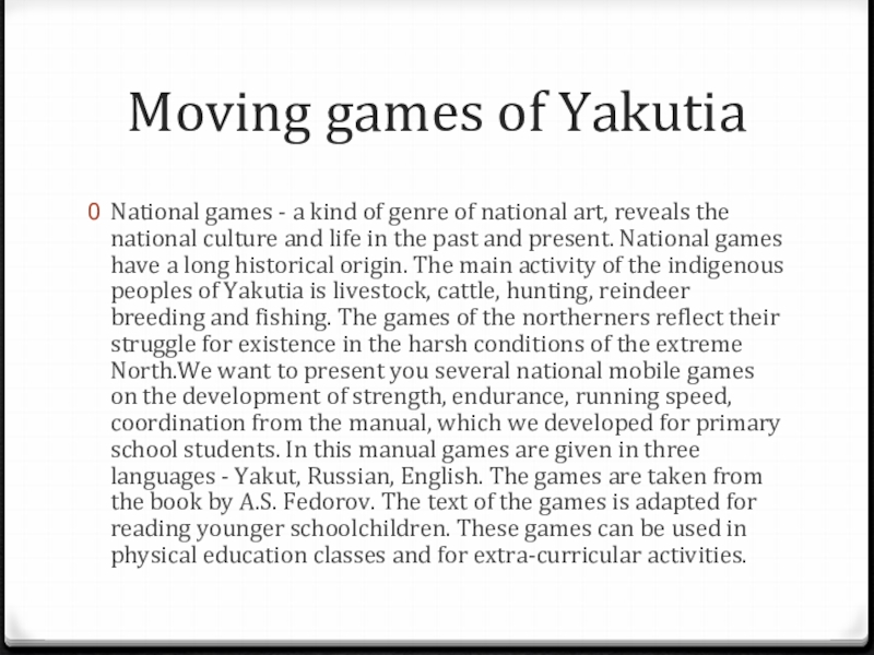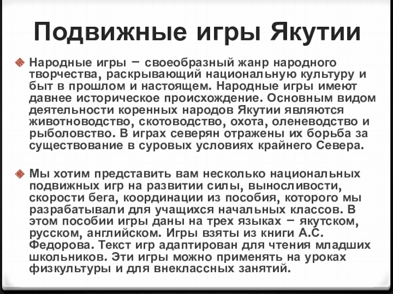 national art, reveals the national culture and life in the past and present. National games have a long historical origin. The main activity of the indigenous peoples of Yakutia is livestock, cattle, hunting, reindeer breeding and fishing. The games of the northerners reflect their struggle for existence in the harsh conditions of the extreme North.We want to present you several national mobile games on the development of strength, endurance, running speed, coordination from the manual, which we developed for primary school students. In this manual games are given in three languages - Yakut, Russian, English. The games are taken from the book by A.S. Fedorov. The text of the games is adapted for reading younger schoolchildren. These games can be used in physical education classes and for extra-curricular activities.