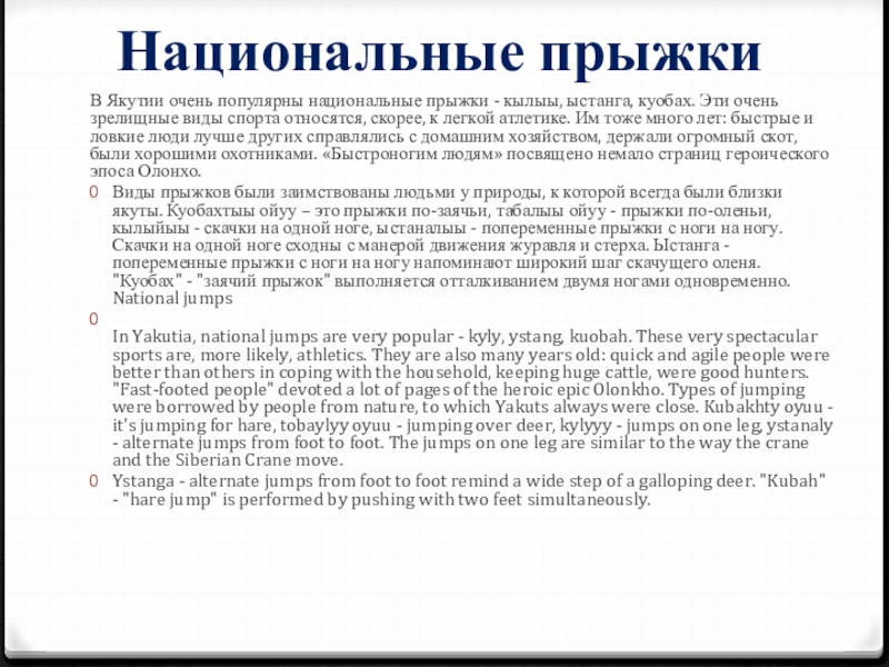 В Якутии очень популярны национальные прыжки - кылыы, ыстанга, куобах.