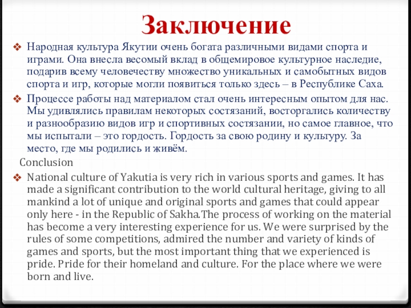 Процессе работы над материалом стал очень интересным опытом для нас. Мы удивлялись правилам некоторых состязаний, восторгались количеству и разнообразию видов игр и спортивных состязании, но самое главное, что мы испытали – это гордость. Гордость за свою родину и культуру. За место, где мы родились и живём.